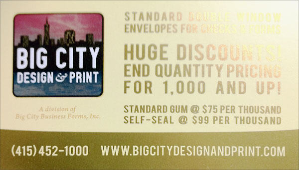 Big City is big where it counts—great responsive service and rock bottom prices. I am treated like my business is important and I appreciate their first hand knowledge of my printing needs.