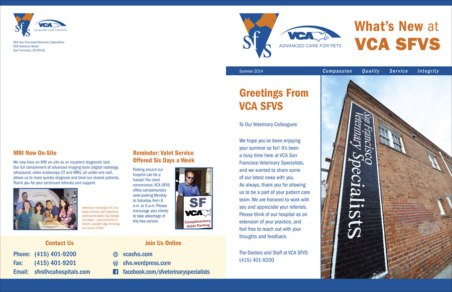 Karen from Big City has partnered with San Francisco Veterinary Specialists for over 12 years. In addition to designing and printing business forms, Big City helped develop our graphic standard and served as an advisor for furniture acquisition and workstation design. It is rare to find a company with the diligence and service commitment of Big City.